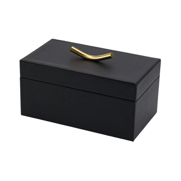 - ★Refined Leather-Texture Appearance | This jewelry box features a smooth black rectangular body topped with a luxurious leather-texture lid and a sculpted gold handle that adds elegance and visual depth. The box’s clean contours and matte finish make it a sophisticated storage piece suitable for modern décor.