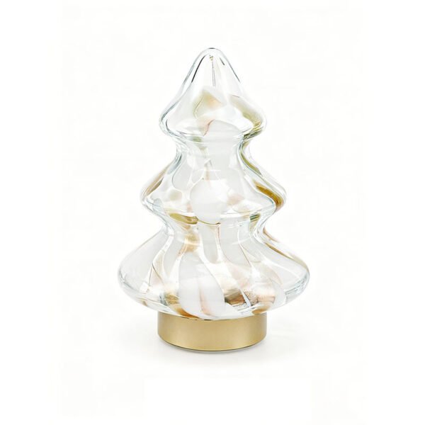 - ★This exquisite festive figurine is crafted from hand-blown glass, forming a classic three-tiered spiral Christmas tree shape. The glass body features an opalescent whitebase tone, embedded with shimmering gold and champagne-colored swirl textures. This effect resembles golden light within falling snowflakes, glittering beautifully in the light for a luxurious and elegant appeal. The base is complemented by a polished brass-tone or gold-toned metal ring which provides stable support and elevates the overall design to a higher aesthetic level, making it a perfect accent for any style of home decor.