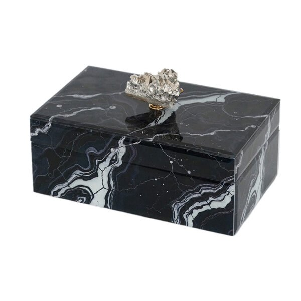 • Striking Appearance & Mineral Art Design- This jewelry box showcases a perfect fusion of natural power and modern design, featuring a deep black marble pattern that creates a dynamic visual effect like meteors in the night sky. Its most striking feature is the silver mineral cluster mounted at the center of the lid, where irregular crystals emit a primitive yet brilliant metallic luster, imbuing the product with unparalleled sculptural beauty. The surface is interlaced with delicate white vein-like textures, which, combined with the sturdy rectangular silhouette, make it more than just a jewelry box, but a captivating artistic ornament.