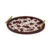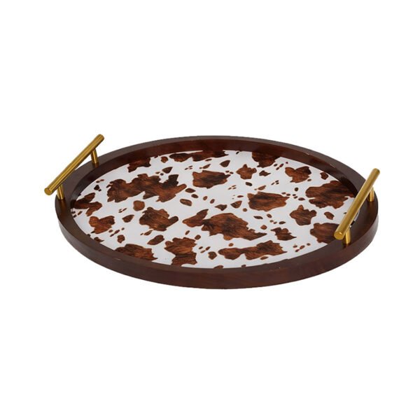 • Exquisite Cow Print Craftsmanship & Elegant Geometric Appearance Features- Perfectly blending natural elements with modern design. The tray is tightly encased in a dark brown solid wood frame, offering a sturdy texture and composed hue, while the interior base features a visually striking cow print. Irregular dark brown patches are artfully scattered across a pure white background, mimicking a realistic leather texture. The most eye-catching feature is the pair of streamlined metallic handles at both ends, whose polished gold coating gleams under light, creating a perfect color contrast with the dark wood and wild print, transforming it from a functional piece into a highly ornamental work of art.