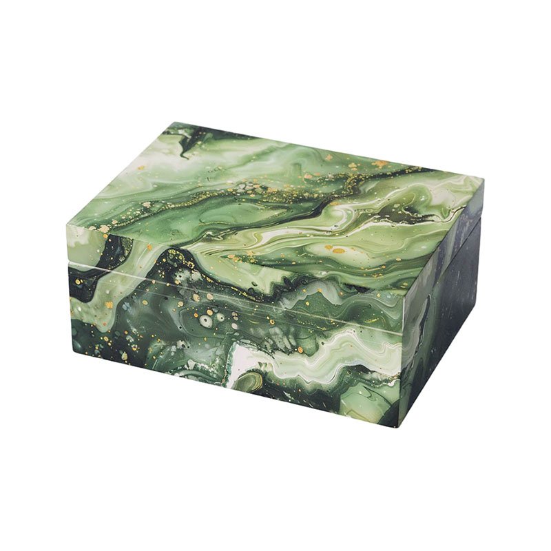 - ★A Fluid Emerald Feast & Deep Liquid Gold Physical Features- This jewelry box presents a breathtaking symphony of colors: the surface is wrapped in intertwined rich dark green and fresh mint green marble textures, resembling tumbling emerald waves. Delicate gold powder is scattered like stardust within the flowing color crevices, creating a high-tension “liquid gold” effect that imbues the product with a raw sense of luxury extracted from natural mineral veins. Its sturdy square geometric silhouette, paired with a modern abstract painting style, allows every texture to exhibit a deep, three-dimensional feel under light—making it more than just a storage container, but a sophisticated standalone piece of desktop art.