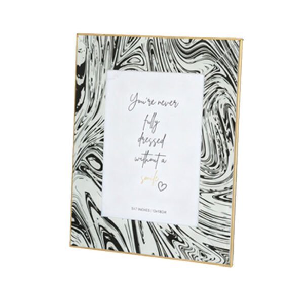 - ★Dynamic Visual Features & Marble Texture Artistry- This artistic frame features an eye-catching abstract fluid texture design, with interwoven black and white lines resembling flowing ink patterns that create a dynamic visual hierarchy across the frame surface. The outer edge is encased in an ultra-fine bright gold border; this striking contrast between calm monochrome tones and luxurious gold imbues the product with a sophisticated modern urban aesthetic. The internal display area is perfectly proportioned to hold a standard 4×6 inch photograph, maintaining its unique sculptural presence whether displayed vertically or horizontally, making it a stunning tabletop photo frame.