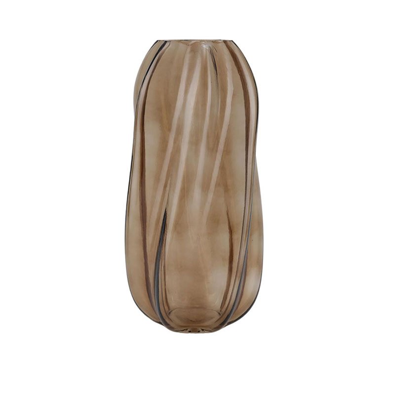 • This artistic piece displays stunning design aesthetics, featuring a translucent smoky brown (amber-toned) hue that exudes sophistication and calmness. The surface is adorned with vertically distributed, subtly curved swirl textures; this undulating wave design creates captivating light and shadow refraction when illuminated. The silhouette is elegantly rounded yet elongated, with a thick, stable base and a smoothly finished rim, perfectly balancing the natural vitality of hand-blown glass with the sleek power of modern industrial design.