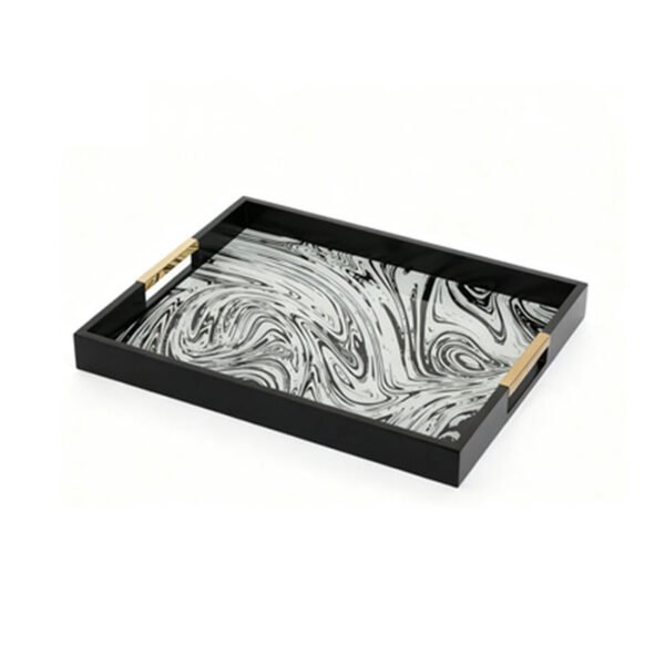 - ★Captivating Appearance & Artistic Texture Design- This artistic tray showcases impactful modern visual art, featuring a vivid black and white marble texture at its base with lines flowing across the surface like ink wash paintings. Surrounded by a steady matte black outer frame, the rectangular geometric silhouette is sleek and professional. The most striking feature is the bright gold metal handles on both sides; this contrast between calm monochrome tones and luxurious gold imbues the tray with a sophisticated modern urban aesthetic and premium texture.