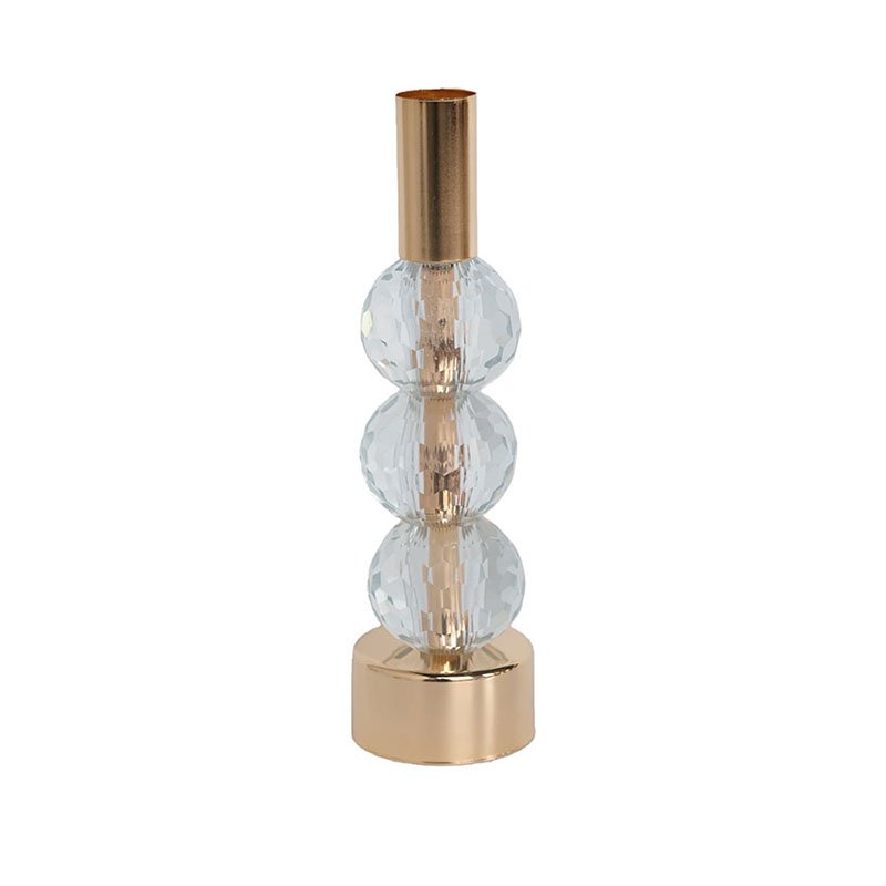 - ★This candle holder stands out with its unique vertical structure and balanced geometric proportions, showcasing unparalleled artistic beauty. The base features a sturdy cylindrical polished gold stand with a pure, mirror-like luster; the middle stem is composed of two stacked transparent crystal spheres of varying sizes with precision-cut facets designed to capture and refract light from all angles, creating a dreamy visual effect. Topped with a matching gold metallic candle socket, this tiered “Gold-Crystal-Gold” design ensures this crystal candle holder appears both dignified and filled with modern industrial sophistication under the play of light and shadow.