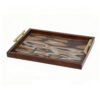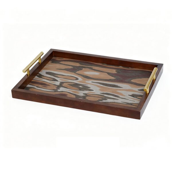 - ★Exquisite Appearance & Artisanal Design Concepts- This stunning wooden tray features a sturdy and substantial rectangular frame finished in a deep walnut hue, showcasing the steady and warm texture unique to solid wood. The most distinctive visual focal point of its design lies in the interior base, where an artistic marbled inlay flows with organic patterns, interweaving various shades of brown, creamy white, and earthy tones to create a natural and primitive sense of dynamic beauty. To balance the richness of the wood, two minimalist cylindrical handles in a brushed gold finish are installed on the sides; their clean lines and lustrous sheen create a striking modern aesthetic contrast against the vintage wood grain.
