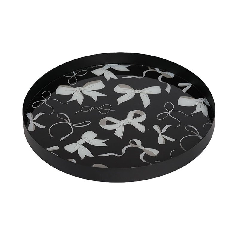 - ★Captivating Appearance & Bow-Knot Aesthetics- This decorative tray (Item No. 180-047) showcases a harmonious blend of classic and modern design, featuring a sophisticated matte black metal frame with a rich texture. The interior of the tray is adorned with an exquisite bow-knot print; silver-grey bows in various sizes and orientations are scattered across the black base, creating an elegant and dynamic visual layering. The edges curve upward to form a smooth vertical rim, which not only defines a perfect circular silhouette but also functionally ensures that items remain securely in place.