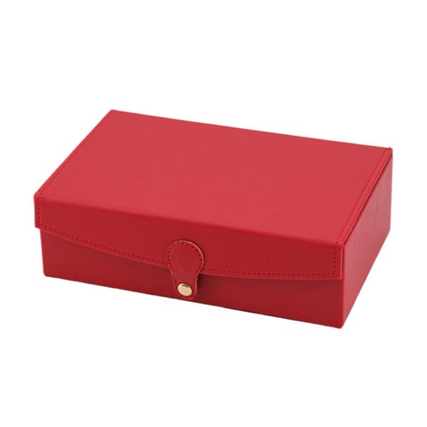 - ★Classic Rectangular Shape & Premium Leather Texture: This jewelry box features a classic rectangular design, covered in bright red smooth faux leather (PU Leather), offering a fine texture and vibrant appeal. The front of the lid is secured by a round leather-accented gold snap/magnetic closure, providing a safe and elegant way to open and close. Its clean lines and overall festive look make it a standout desktop accessory.