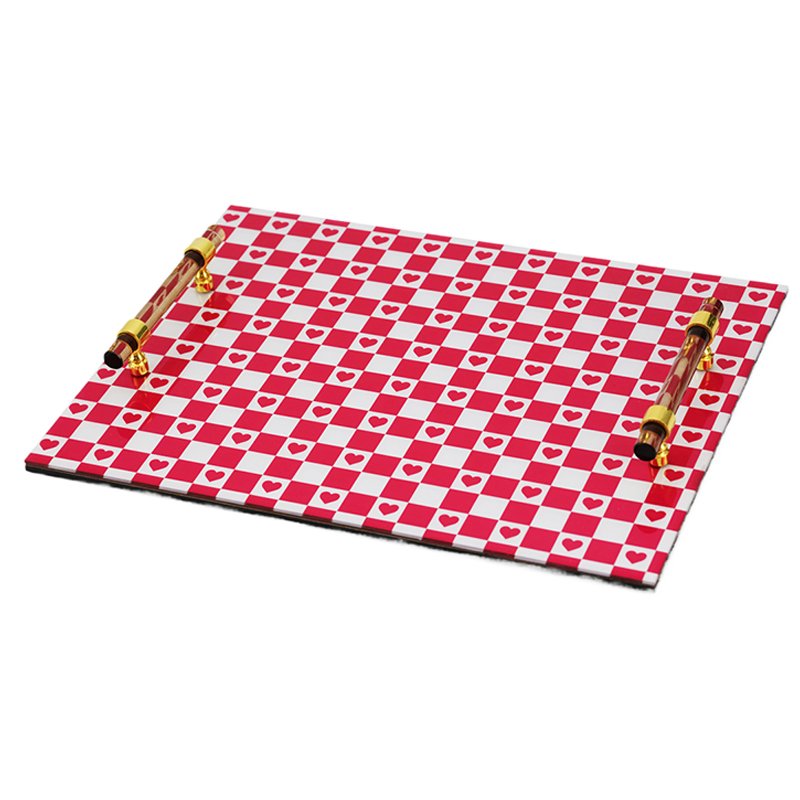- ★Unique Red and White Checkered Pattern with Gold Cylinder Handles: This tray features a striking rectangular red and white checkered pattern design, with a red heart motif in each white square, making the theme romantic and lively. The tray is crafted from high-clarity glass material, ensuring a clear shine and premium texture. Both ends are fitted with luxurious gold-based clear cylinder handles, providing an appearance that is both playful and high-end.