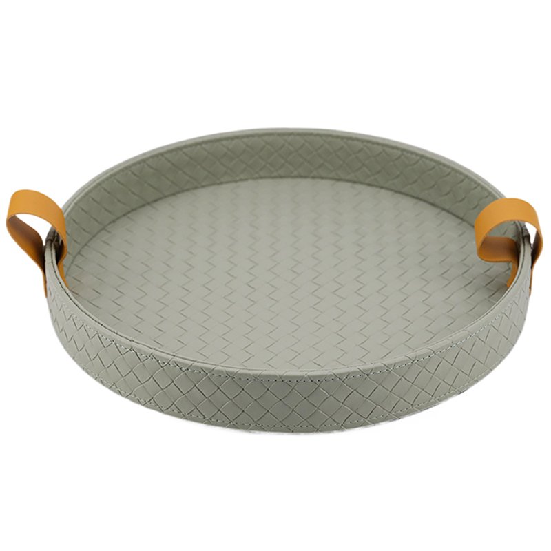 large-sized Round Woven Leather Tray with Handles, Decorative Storage Tray for Home, Stylish Fruit Tray & Veggie Tray