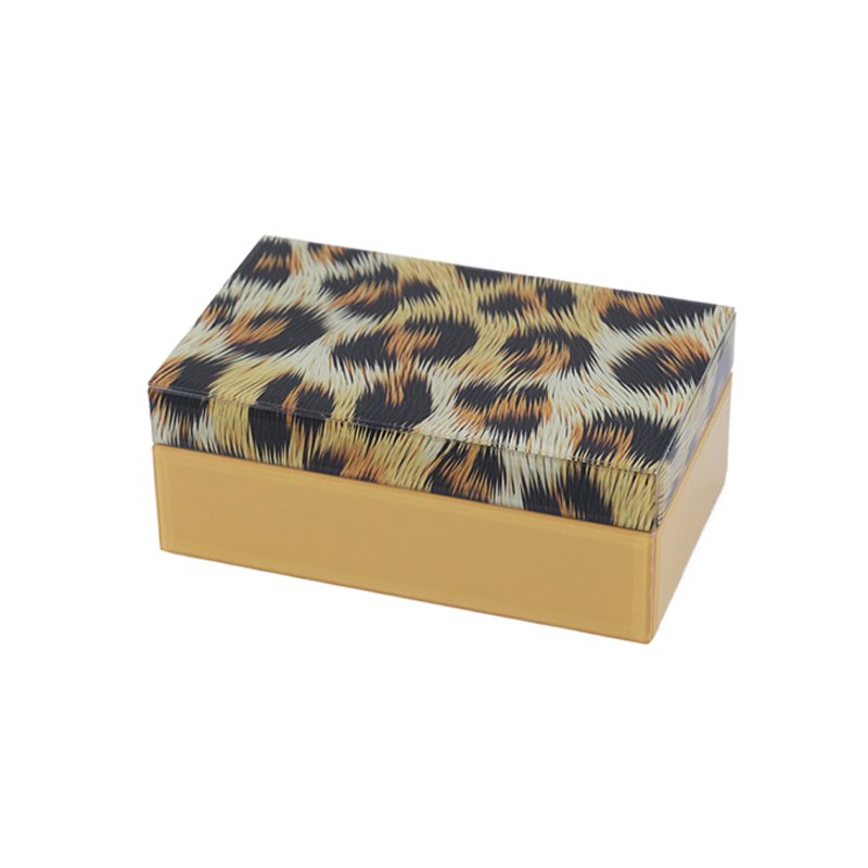 - ★Unique Two-Tone, Dual-Material Layered Design: This jewelry box utilizes a classic rectangular casing structure, composed of two main sections. The lid features a vibrant, realistic leopard print pattern, where brown, black, and amber tones intertwine, creating a strong Home Decor visual impact. The base (assumed smooth acrylic or glass) is a high-gloss solid amber (or light tan-yellow) color. This combination of a wild top and minimalist base creates a bold and luxurious Home Decor style.