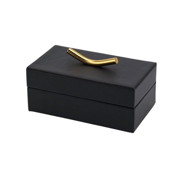 - ★Refined Leather-Texture Appearance | This jewelry box features a smooth black rectangular body topped with a luxurious leather-texture lid and a sculpted gold handle that adds elegance and visual depth. The box’s clean contours and matte finish make it a sophisticated storage piece suitable for modern décor.