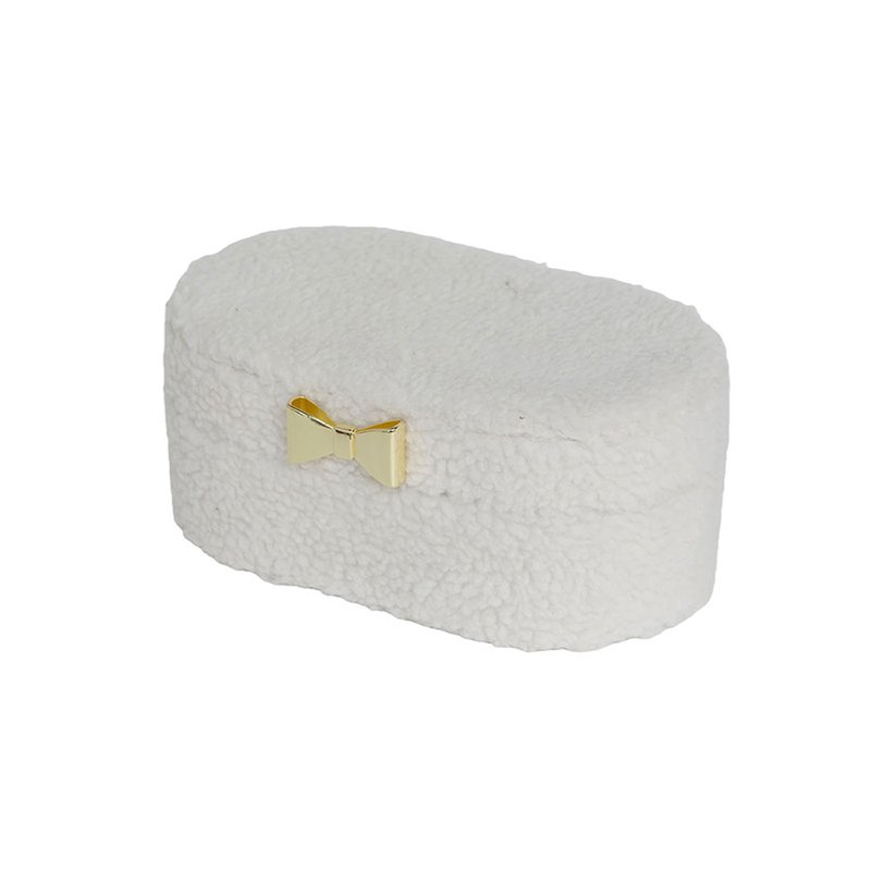 Luxury Creamy Teddy Plush Jewelry Box – Creative Sherpa Oval Jewelry Box, with Gold Metal Bow Detail, Winter Cozy Jewelry Gift Box for Rings and Earrings, Modern Luxe Home Decor Desktop Organizer, Ideal Holiday Gift