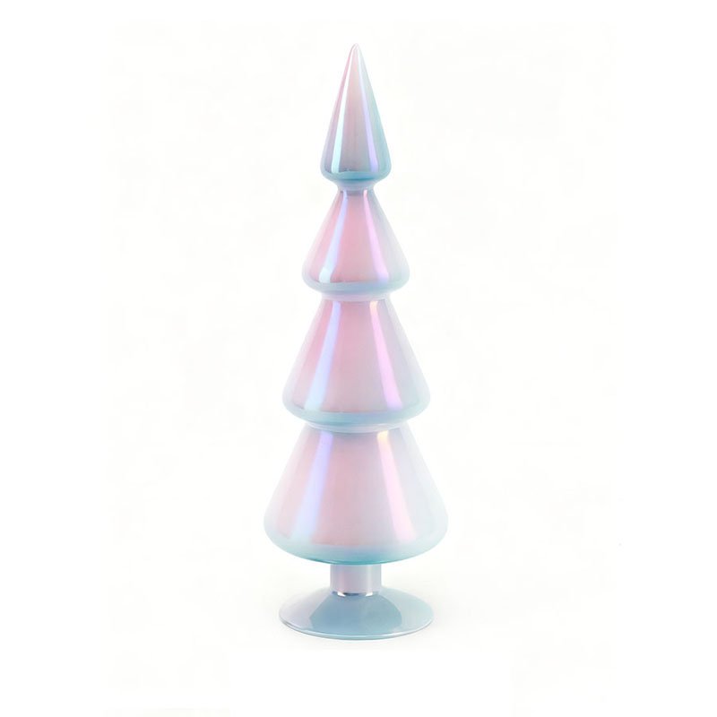 • Ethereal Four-Tier Tower Silhouette & Iridescent Aurora Visual Effects- This ornament stands out with its unique physical characteristics: the overall structure features a minimalist four-tier tower design, tapering from a broad base to a slender conical tip with fluid, architectural lines. The surface is coated with a dreamy iridescent finish that reflects a mother-of-pearl aurora luster; subtle interweaving shades of pale blue and soft pink shimmer under the light, imbuing the glass tree with a crisp, pure essence reminiscent of the Arctic wilderness.