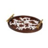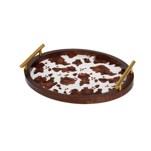 - ★Exquisite Cow Print Craftsmanship & Elegant Geometric Appearance Features- Perfectly blending natural elements with modern design. The tray is tightly encased in a dark brown solid wood frame, offering a sturdy texture and composed hue, while the interior base features a visually striking cow print. Irregular dark brown patches are artfully scattered across a pure white background, mimicking a realistic leather texture. The most eye-catching feature is the pair of streamlined metallic handles at both ends, whose polished gold coating gleams under light, creating a perfect color contrast with the dark wood and wild print, transforming it from a functional piece into a highly ornamental work of art.