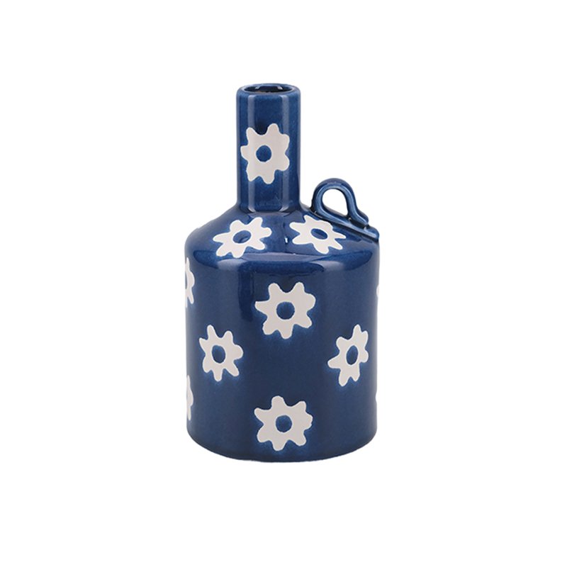 Home - HOME DECOR - Vase - Medium Blue Ceramic Vase with Glossy Glaze and White Daisy Motifs, Cylindrical Shape Decorative Shop Spring Flower Vase for Modern Interiors