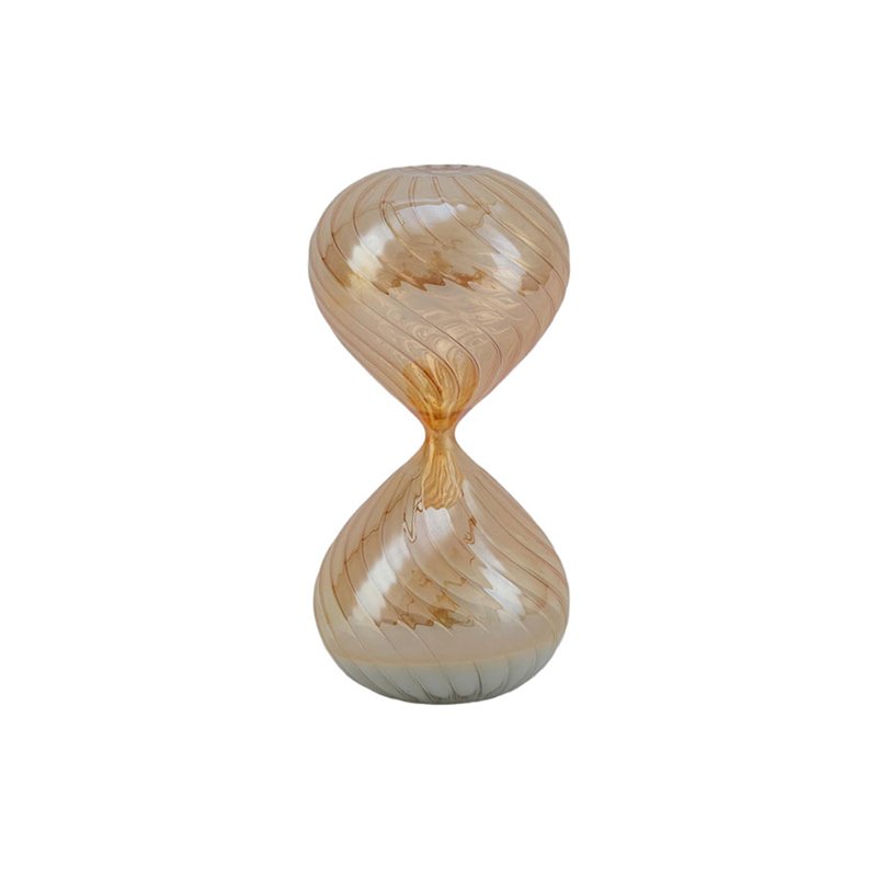 • This hourglass stands out with its enchanting amber gold hue, presenting a crystal-clear, translucent aesthetic. The surface features a unique swirl texture design that creates dynamic reflections under light, significantly enhancing its visual depth. The classic symmetrical bulb shape is perfectly proportioned, with a naturally streamlined waist. Even when not in use as a timer, it serves as a highly modern artistic hourglass.