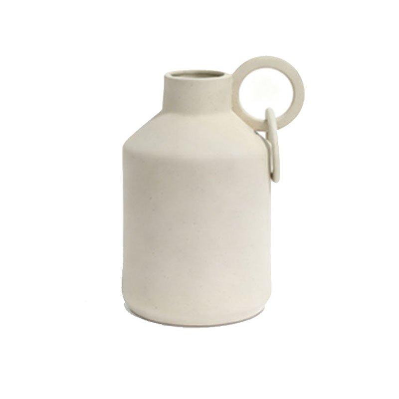 - ★This unique Vase features a cylindrical jar-like structure, slightly wider at the base, narrowing at the neck, and having a smaller opening. The entire body is finished in a warm cream white or off-white color, with a non-glossy matte ceramic texture. This finish gives it an earthy yet sophisticated modern appeal. Most striking is its asymmetrical handle design: a thick, circular ring handle is attached to the side of the Ceramic Vase near the top via a vertical connector, a feature that adds visual interest and suggests portability. The overall shape is simple yet full of design flair.