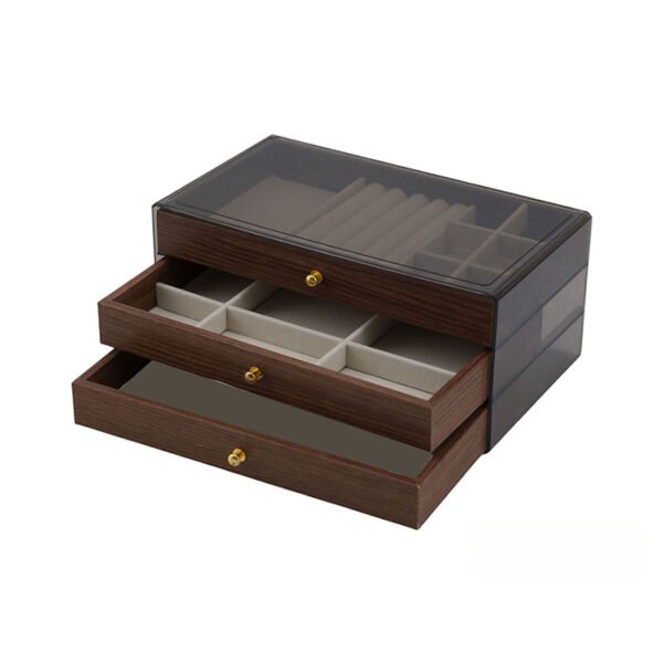 Home - HOME DECOR - Jewelry Box - Modern 3-Drawer Jewelry Box with Walnut Wood Grain Texture, Large Capacity Acrylic Jewelry Organizer with Transparent Lid, Luxury Jewelry Gift Box Aesthetic Display Case for Rings, Earrings & Necklaces