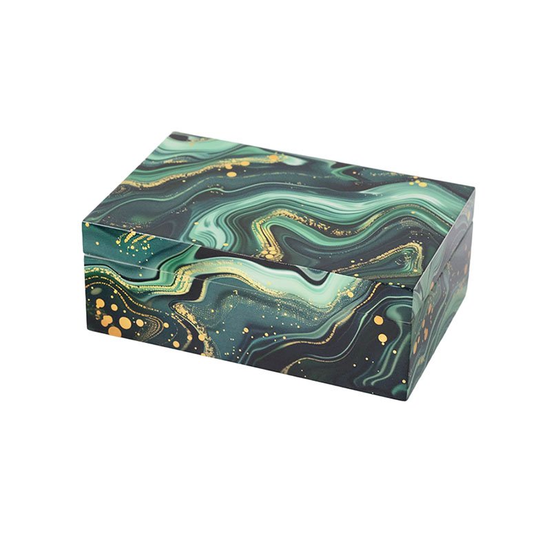 • Enchanting Emerald Liquid Gold Texture & Artistic Physical Features- This jewelry box demonstrates a powerful modern deconstructive aesthetic in its design: its surface is covered with deep emerald marble textures, presenting a sense of fluid movement like a liquid aurora. Shimmering gold streamlines and dynamic gold polka dots are cleverly interspersed within the texture, as if stars have fallen into a tranquil lake, adding rich visual layers and a luxurious sensory depth to the rectangular silhouette. Its clean-cut edges, paired with a high-clarity glazed finish, ensure it becomes an undeniable artistic focal point on your vanity.