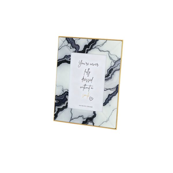 • Captivating Visual Features & Fluid Marble Texture Design- This photo frame represents the pinnacle of modern abstract art, featuring a wide frame surface adorned with dynamic black-and-white marble textures that resemble flowing ink spreading on rice paper. Its most captivating design feature is the fluid sense of movement, where black and white hues interweave into sand-like swirls and waves, imbuing the static frame with a rhythmic beauty. The outer edge is traced with a slender golden rim, creating a striking contrast between metallic luster and ink-wash texture, which combined with the crisp rectangular silhouette, makes it a perfect artistic photo frame from every angle.