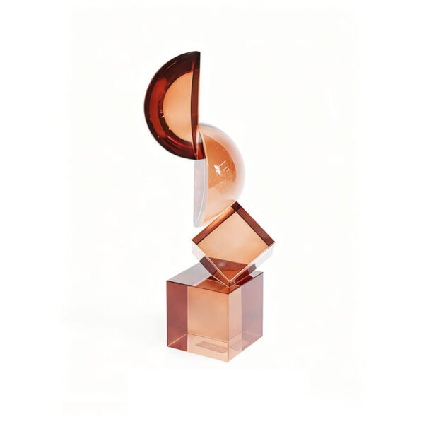 • Unique Geometric Stacked Structure & Multidimensional Visual Tension Features- Featuring a composition of precision geometric forms stacked from bottom to top, showcasing a stunning sense of dynamic balance. The base is a solid, large transparent cube supporting a smaller cube tilted at a 45-degree angle, which then transitions into a full hemisphere, crowned by two elegantly staggered crescent-shaped arcs at the peak, imbuing the piece with a sense of upward extension and spatial exploration. Crafted entirely from deep, warm amber-orange crystal, the alternating fine frosted and polished finishes allow every facet to capture and refract layers of warm-toned light, presenting a crystal-clear yet substantial artistic texture.