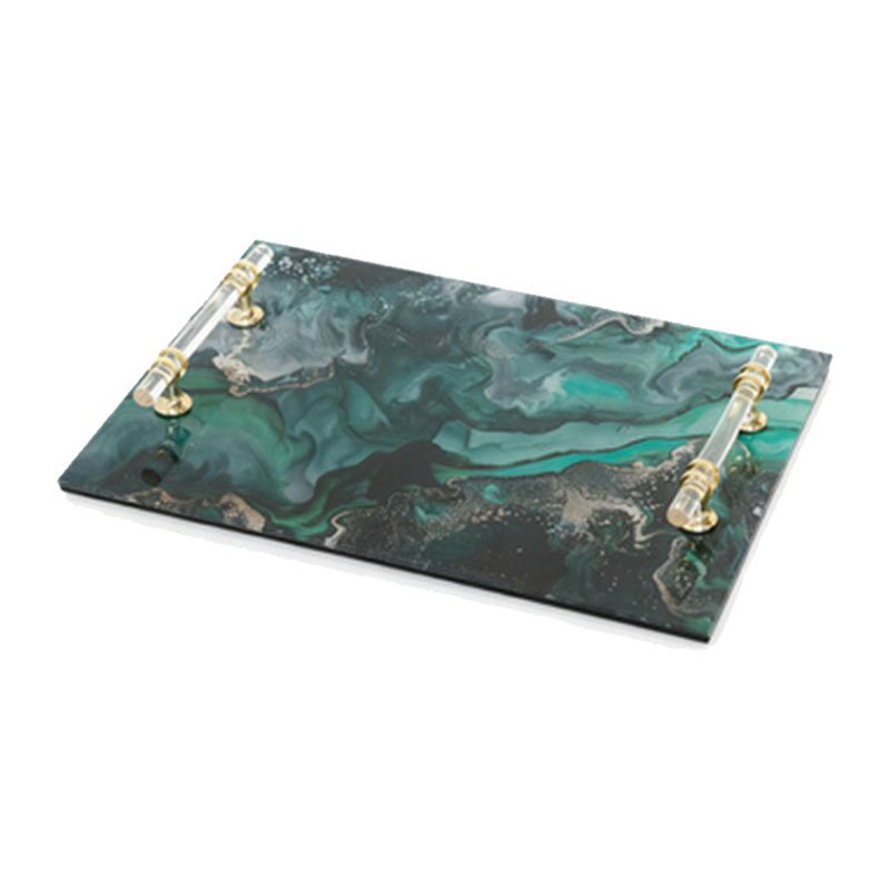 • Captivating Emerald Marble Texture & Gold-Veined Craftsmanship Details- This tray is a visual masterpiece, with its surface covered in distinct emerald marble textures where deep and dark green blocks interweave to perfectly simulate the fluid motion of natural jade. The most unique feature is the hand-applied gold-veined powder embedded within the surface, sketching starlight-like gold lines across the green base, which, paired with crystal-clear acrylic handles and gold metal connectors on both sides, showcases a highly modern and chic light-luxury aesthetic.