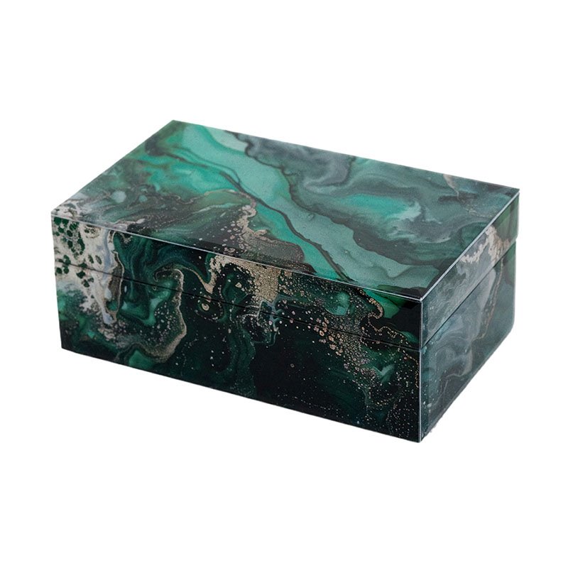 • Captivating Emerald Marble Texture & Gold-Veined Craftsmanship Details- This jewelry box demonstrates high artistic achievement in its appearance: the surface is covered with deep-layered emerald marble textures, interwoven with dark and light green streamlined color blocks that perfectly simulate the warm texture of natural jade. The most unique feature is the hand-applied gold powder accents that spread across the deep green base like a galaxy, creating a visually striking gold-veined speckled effect. The overall design utilizes a steady and generous rectangular silhouette with crisp lines, showcasing a modern light-luxury sensory art.