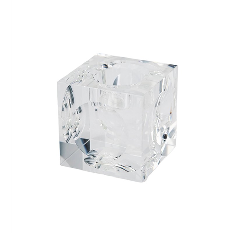 Modern Clear Cube Candle Holder with Circular Carved Sides, Minimalist Geometric Crystal-Like Design for Tabletop Decor, Elegant Candle Holders for Home, Fits Standard Candles