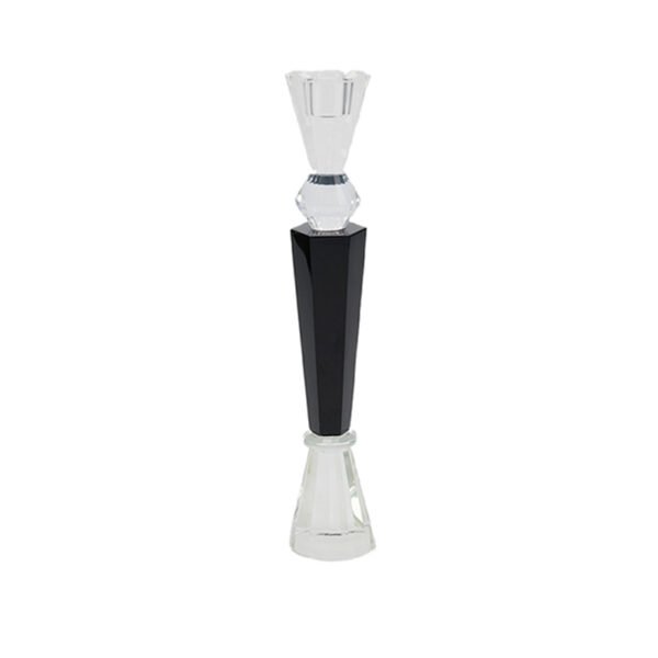 - ★Geometric Sectional Design with Black and Clear Contrast: This candlestick exhibits an elegant vertical stemmed silhouette, formed by stacking multiple geometric cut sections. The base and top are made of clear crystal (or acrylic), while the central section features a striking black inverted frustum, creating a classic, high-contrast black and white look. The connection points between the crystal sections (such as the middle clear spherical crystal) add depth and refinement to the design. The overall appearance is tall, measuring 30.5 cm, with sharp lines and defined facets, reflecting a modern minimalist geometric aesthetic.