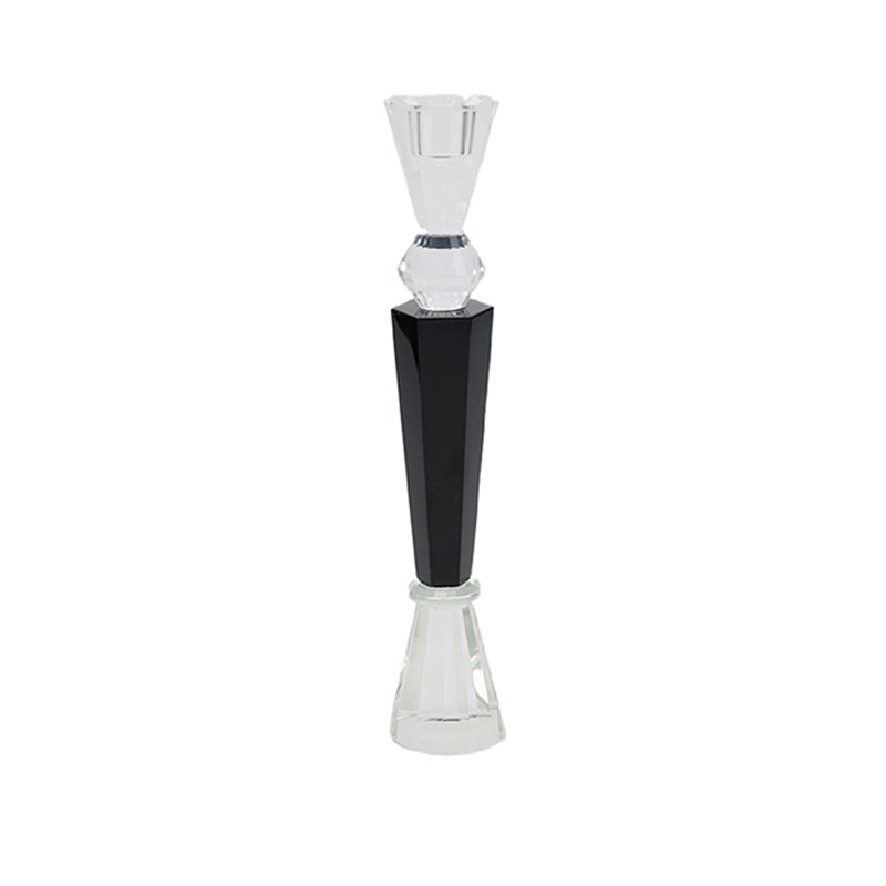 - ★Geometric Sectional Design with Black and Clear Contrast: This candlestick exhibits an elegant vertical stemmed silhouette, formed by stacking multiple geometric cut sections. The base and top are made of clear crystal (or acrylic), while the central section features a striking black inverted frustum, creating a classic, high-contrast black and white look. The connection points between the crystal sections (such as the middle clear spherical crystal) add depth and refinement to the design. The overall appearance is tall, measuring 30.5 cm, with sharp lines and defined facets, reflecting a modern minimalist geometric aesthetic.