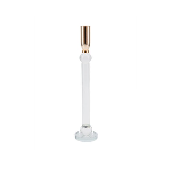 - ★Minimalist Slender Silhouette with Luxurious Gold Cup: This candlestick features a tall and minimalist cylindrical structure. The main body is a slender, high-clarity crystal stem, accented by a spherical crystal ornament at both the base and top, adding visual layering. The top design is particularly striking: it consists of a high-gloss gold metal candle cup, creating a modern, high-contrast material pairing with the clear crystal stem below. The overall shape is elegant and airy, making it a refined art piece in Home Decor.