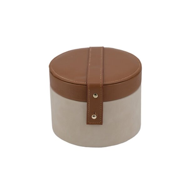 - ★Distinctive Two-Tone Round Leather Design with Practical Top Handle: This jewelry box features a classic cylindrical shape but achieves a high-end modern feel through its two-tone paneling. The main body is covered in a light beige or khaki leather/faux leather material, with a possibly smooth or fine suede texture; the lid, however, uses a contrasting warm brown leather. A matching brown leather handle is attached across the lid and secured to the body with gold studs, enhancing portability while adding a visual focal point and light luxury detail to the design. This makes it more than just storage, but an elegant desktop Ornament.