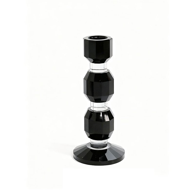 - ★Striking Visual Features & Faceted Craftsmanship- This artistic candle holder (Item No. 105-046) adopts a highly modern pillar structure, composed of three precision-polished black octagonal faceted geometric segments stacked vertically, showcasing an architecturally rigorous aesthetic. Each facet is meticulously treated to capture and refract surrounding light from all angles, presenting a deep and dazzling luster akin to obsidian. Transparent crystal-like connecting rings are cleverly embedded between the black geometric segments; this “black and clear” material contrast not only enhances visual transparency but also adds a touch of lightness and agility to the steady form, making it a truly unforgettable crystal candle holder.