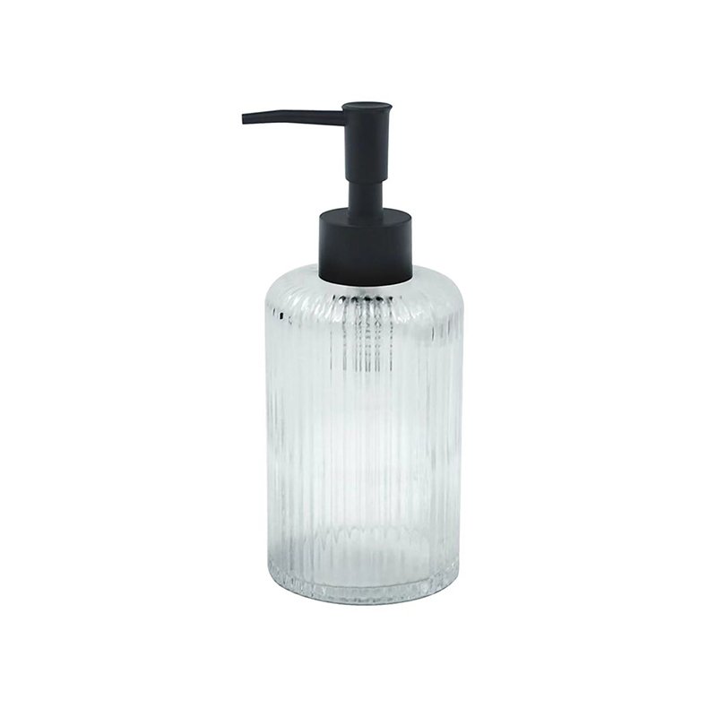 • Elegant Vertical Ribbed Glass Body with Black Pump Contrast: This lotion dispenser features a classic cylindrical silhouette, with the main body crafted from highly transparent, thick glass. The glass surface is evenly lined with vertical raised ribs, enhancing light refraction and providing visual dimension. It is topped with a sleek black press pump head and spout, where the strong contrast between black and clear glass makes the aesthetic fashionable and high-end.