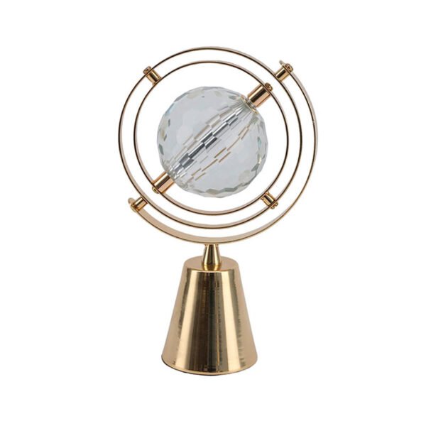 • This striking ornament features a multi-faceted transparent crystal sphere encased within three layers of interlocking gold metallic orbital rings, presenting a tech-inspired aesthetic of a miniature armillary sphere. The most prominent feature is the precision-cut crystal ball suspended in the center, which refracts light from multiple angles to create a brilliant sparkle. The orbital rings are crafted with fine gold electroplating, offering a bright and textured finish, vertically supported by a stable conical metal base. This unique structure allows it to stand out among other decorative ornaments, perfectly complementing various modern home decor styles.
