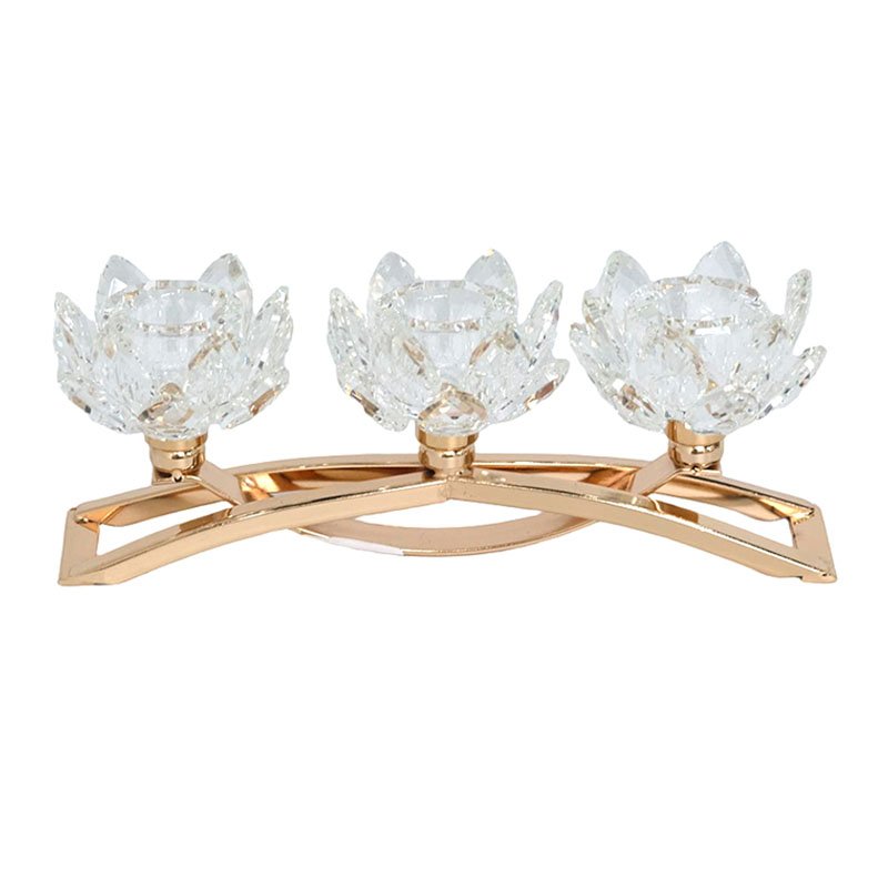 • Radiant 3-Arm Lotus Appearance & Fine Architectural Configuration- This candle holder exhibits a ceremonial sense of balanced aesthetics: its base is supported by a precise set of champagne gold hollowed arched metal frames with clean, geometric lines. Three blooming crystal lotuses are arranged horizontally atop the base, each petal meticulously multi-faceted from high-clarity K9 crystal with sharp, translucent edges that capture and refract ambient light like diamonds. This combination of solid metal and soft crystal lotuses not only forms its unique artistic silhouette but also ensures it becomes an unmissable focal point in any space.