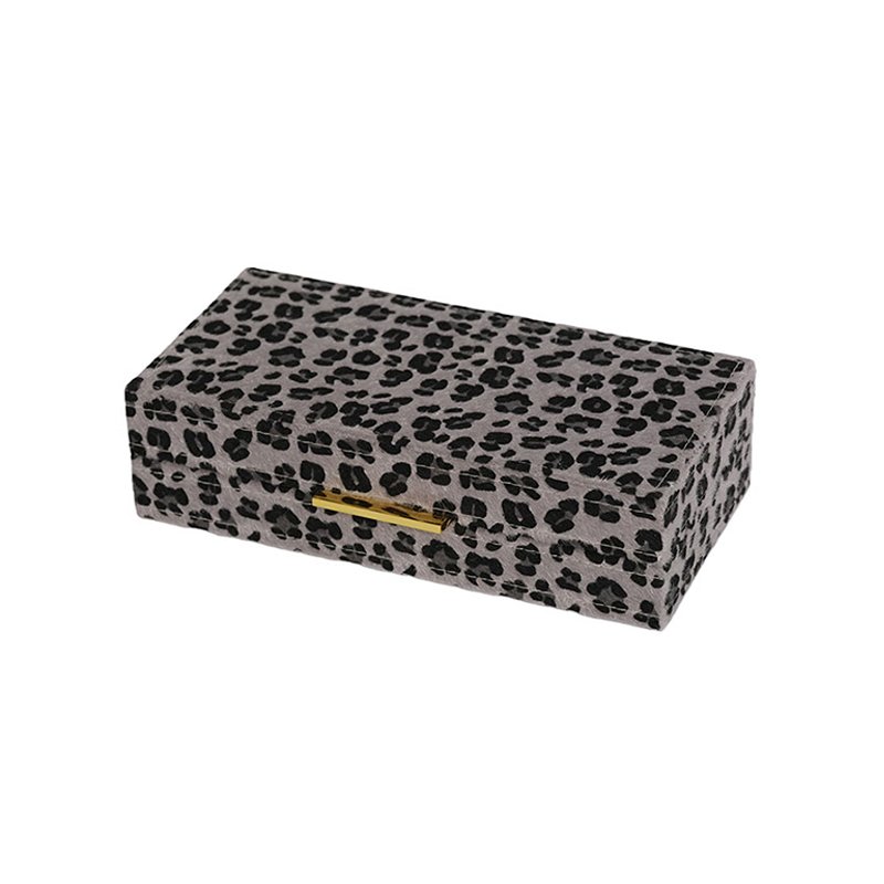 - ★Luxurious Wild Aesthetics & Delicate Tactile Design- This piece exhibits a captivating wild charm, with its surface entirely wrapped in a highly tactile grey faux fur material featuring a three-dimensional, interwoven leopard pattern. Dark spots are scattered across a soft light-grey base, creating a layered visual tension. The jewelry box features a clean rectangular silhouette, accented by a striking gold metal clasp at the opening; the collision of cool grey textures with bright metal makes it more than just an organizer—it is a highly artistic tabletop ornament.
