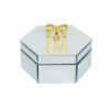 • Chic Hexagonal Mirrored Silhouette & Gold Bow-knot Detail- This jewelry box demonstrates high visual recognizability through its sophisticated design, featuring refined physical characteristics: the overall structure is a regular hexagon, with the body and lid crafted from high-transparency premium mirrored glass panels, offering sharp angles and architectural beauty. The most striking detail is the 3D gold bow-knot handle mounted atop the lid, which is full in shape and brilliant in luster, creating a bold visual contrast with the crystalline mirrored surfaces and imbuing the product with a regal, luxurious texture.
