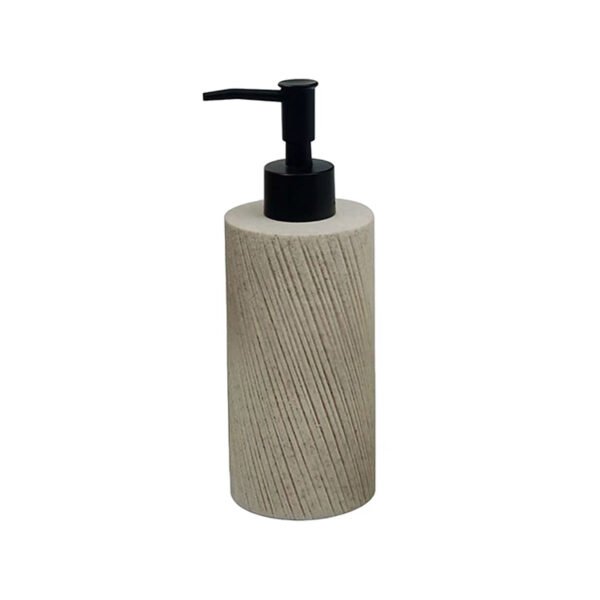 - ★Unique Beige Diagonal Ribbed Texture Design: This lotion dispenser features a simple cylindrical silhouette, with the main body presenting a soft beige or light gray tone. The bottle surface is sculpted with a distinctive diagonal ribbed texture, adding visual depth and tactile appeal. It is topped with a sleek black press pump head and spout, which provides a sharp and fashionable contrast to the body’s rough texture and light color。