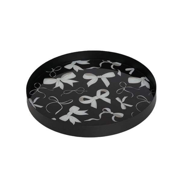 - ★Captivating Appearance & Bow-Knot Aesthetics- This decorative tray (Item No. 180-047) showcases a harmonious blend of classic and modern design, featuring a sophisticated matte black metal frame with a rich texture. The interior of the tray is adorned with an exquisite bow-knot print; silver-grey bows in various sizes and orientations are scattered across the black base, creating an elegant and dynamic visual layering. The edges curve upward to form a smooth vertical rim, which not only defines a perfect circular silhouette but also functionally ensures that items remain securely in place.