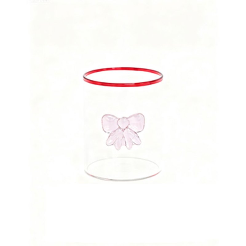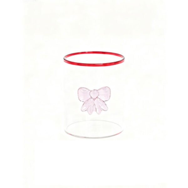 • Exquisite Bow-knot Silhouette & Dual-Tone Contrast Design- This glass cup stands out visually with its unique feminine design. Its physical appearance is highly refined: the body is crafted from high-transparency premium glass in a classic cylindrical shape; the rim is cleverly traced with a vibrant red line, injecting a pop of energetic color into the crystalline body. The most striking detail is the 3D pink glass bow-knot accent mounted on the side, which is full and textured, creating a sharp visual layer against the red rim and making it a highly artistic tabletop ornament.