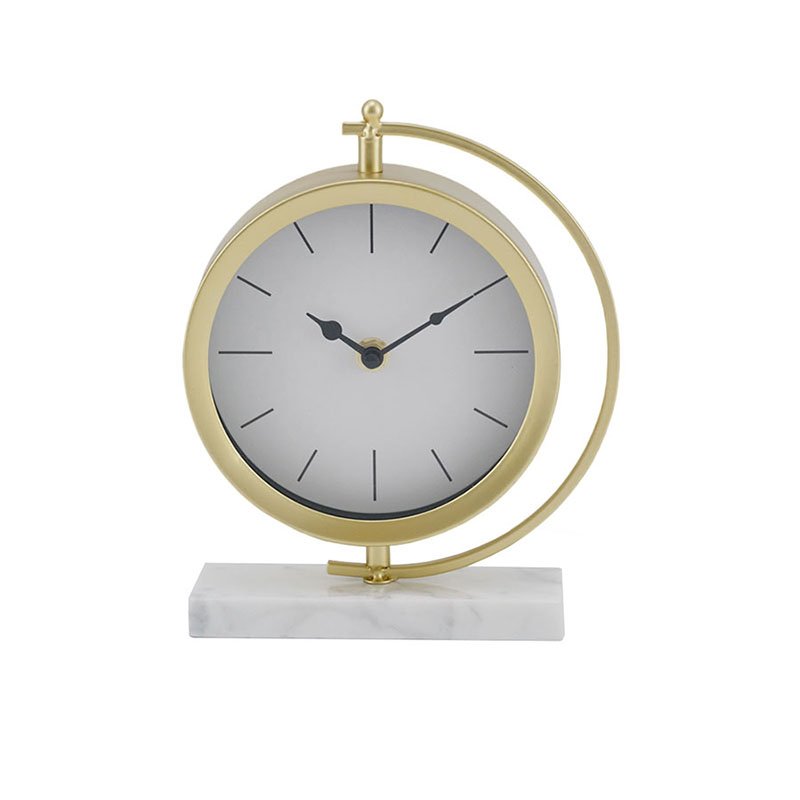 • This clock exhibits a perfect fusion of minimalism and geometric aesthetics, featuring an impressive artistic silhouette. It boasts an elegant circular gold metal frame thoughtfully paired with a semi-circular support rod, creating a dynamic look reminiscent of a celestial globe. The base is crafted from a solid piece of thick, natural white marble, whose unique grey veining gives each piece its own distinct character. The dial features a pure white background, eschewing cluttered numbers for slender black dash indices and long hands, ensuring clear readability while radiating a sophisticated Scandinavian aesthetic.