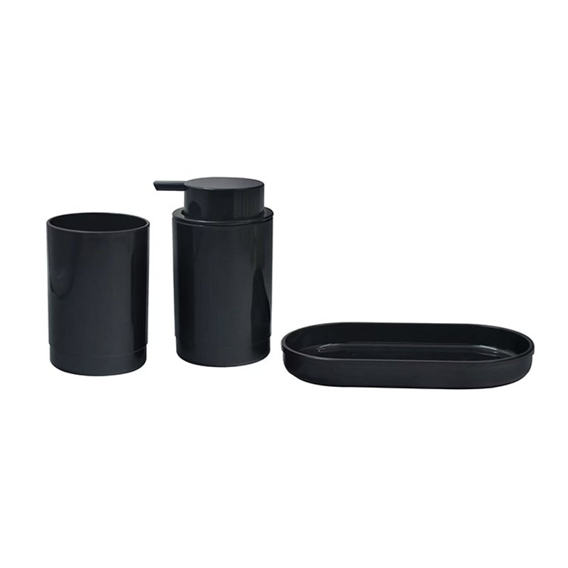 • Minimalist Matte Pure Black Silhouette and Cohesive Design: This 3-piece set features a unified matte pure black finish, crafted from smooth, non-reflective premium resin or plastic for an understated, luxurious feel. The set includes a cylindrical tumbler, a lotion dispenser with an integrated pump head, and a flat oval soap dish. All components feature sleek surfaces and minimalist lines, collectively fostering a professional, tidy, modern bathroom aesthetic.