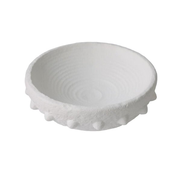 - ★Unique Frosted Granular Texture & Studded Silhouette Design- This artistic bowl displays a visual logic full of primitive beauty, featuring a pure white tone and a surface covered in a delicate granular frosted texture that provides a tactile experience similar to natural stone. The most unique design element is the ring of three-dimensional studded protrusions encircling the exterior wall, which, combined with the slightly irregular wavy edge of the rim, creates a striking contrast between ruggedness and refinement. The interior features matching concentric ribbed patterns that add visual depth and layers, making it a highly recognizable ornament.