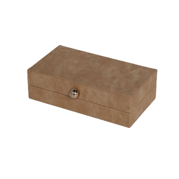 • This jewelry box perfectly embodies the “less is more” philosophy, featuring a clean, structured rectangular silhouette with modern, sharp lines. The exterior boasts a sophisticated matte tan (camel) finish that feels warm to the touch and provides a soothing visual comfort. The most striking highlight is the polished silver sphere clasp at the center; its mirror-like metallic finish creates a bold contrast against the understated box color. This design not only allows for easy one-handed access but serves as a brilliant focal point, ensuring this PU jewelry box stands out on any vanity.