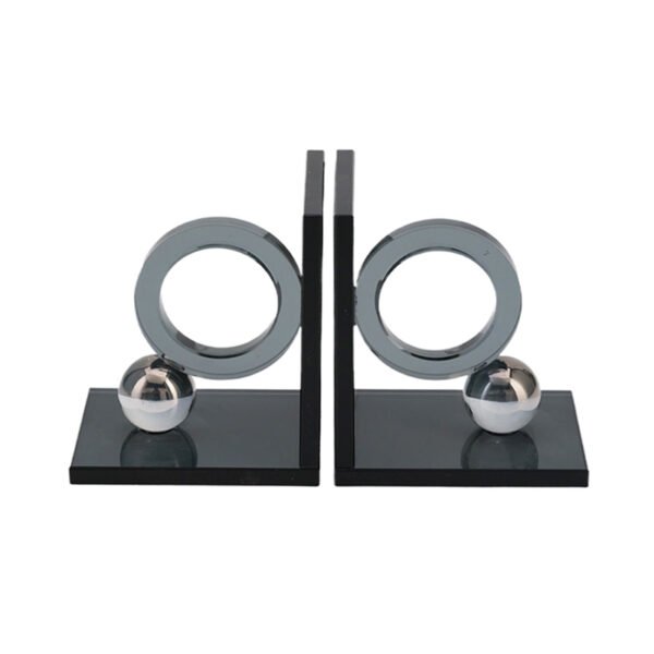 - ★Unique Geometric Aesthetic — This set of bookends features interlocking silver circular rings balanced atop reflective chrome spheres, resting on a glossy black base that exudes contemporary style.