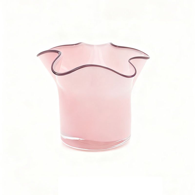 • Captivating Ruffle Silhouette & Dark-Edged Visual Impact- This vase stands out with its highly layered physical characteristics: the overall structure features an elegant goblet shape, with an exaggerated and vivid wavy ruffled mouth. The most exquisite detail is the deep purple refined edging along the rim, creating a striking visual contrast with the pink body. Crafted from high-quality soft pink glass with a delicate matte finish, it emits a warm, fatty, soft-focus aesthetic full of modern fashion, while the smooth transparent base ensures both stability and visual lightness.