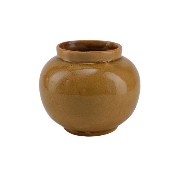 - ★This piece demonstrates a high level of ceramic aesthetics, featuring a beautifully rounded, bulbous body with smooth, dynamic lines. The most captivating feature is its “ice-crackle” glaze finish; the intricate, interlacing patterns under the warm mustard-yellow tone create a vintage texture that feels seasoned by time. The rim is elegantly narrowed and smoothly finished, presenting a sophisticated yet rustic industrial art appeal that is rich in both tactile feel and visual depth.