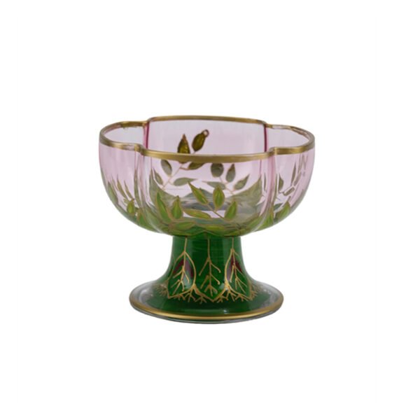 Home - HOME DECOR - Ornament - Pink & Green Hand – Painted Glass Compote with Gold Accents, Floral Leaf – Designed Pedestal Bowl for Home Decor & Serving